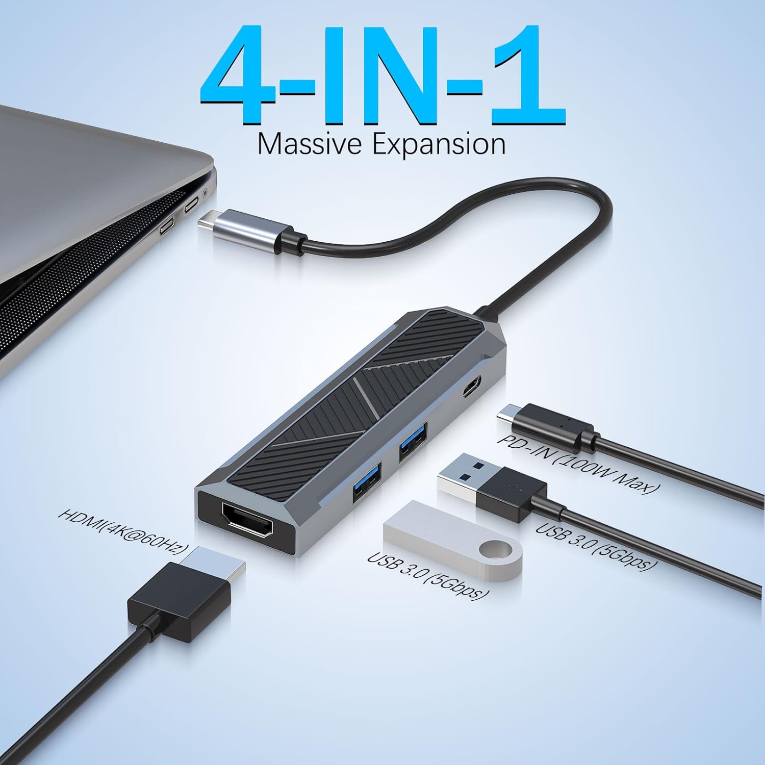 Концентратор USB-C 4-в-1 із розгалужувачем HDMI 4K 60 Гц — це багатофункціональний пристрій розширення, який підключається до ноутбука, планшета чи сумісного пристрою через інтерфейс USB-C. Він перетворює один порт USB-C на чотири основні варіанти підключення, як правило, включаючи вихід дисплея HDMI і кілька портів даних USB.