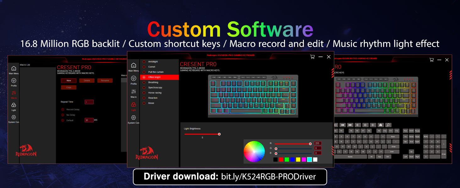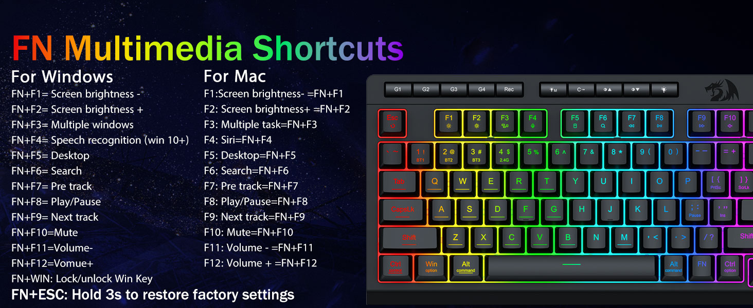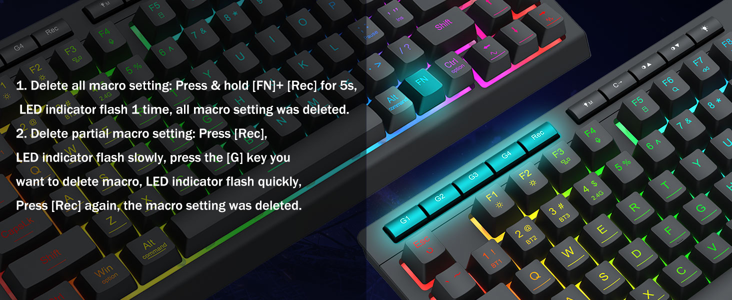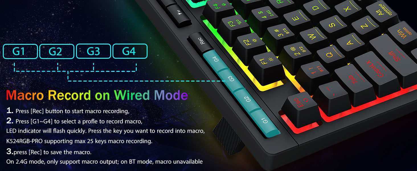 Настроювані макроси, легке керування- Миттєво запрограмуйте 4 вбудовані макроклавіші (G1-G4) — програмне забезпечення не потрібне. Записуйте складні комбінації для ігор, ярлики для підвищення продуктивності або мультимедійні команди. Перевизначте свій робочий процес за лічені секунди. Ви також можете використовувати програмне забезпечення, щоб налаштовувати функції, створювати макроси, регулювати світло RGB і встановлювати ярлики.