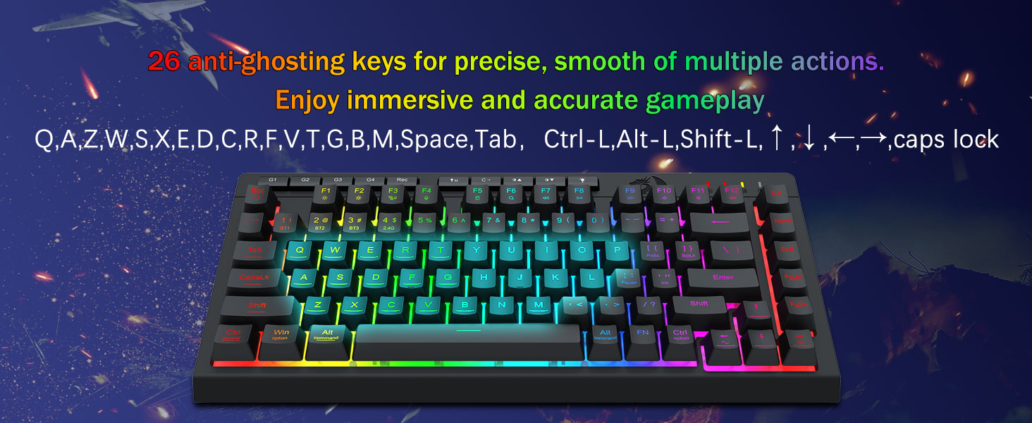 Професійна ігрова продуктивність і спеціальні елементи керування з підсвічуванням- Оснащені клавішами захисту від ореолів (клавіші з підкресленням), які дозволяють 26 клавішам працювати одночасно для швидкої та точної відповіді гри, як ви планували. Кнопки швидкого доступу для яскравості, режиму освітлення та ігрового режиму, щоб швидко налаштувати яскравість, профілі освітлення та ввімкнути ігровий режим одним дотиком кнопки.