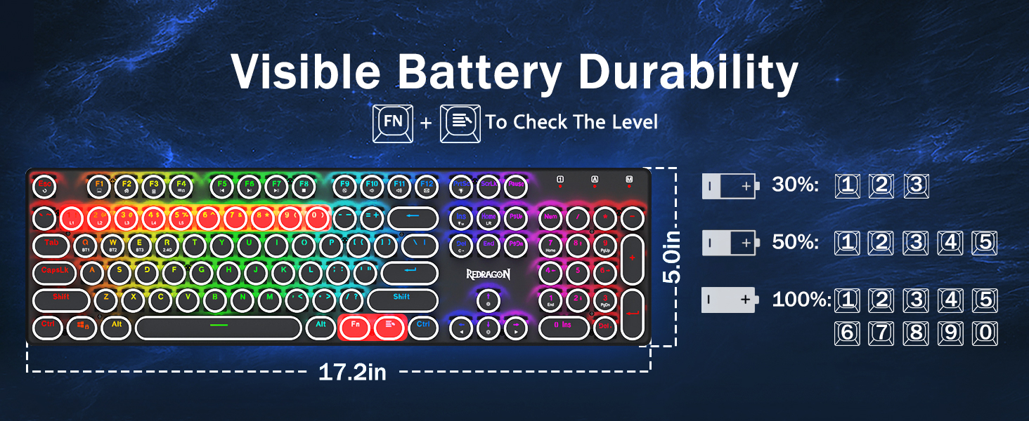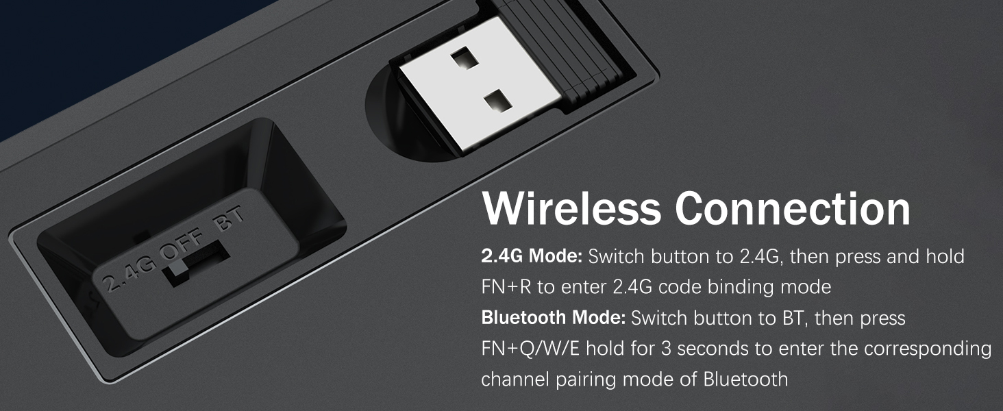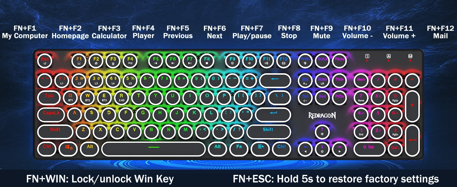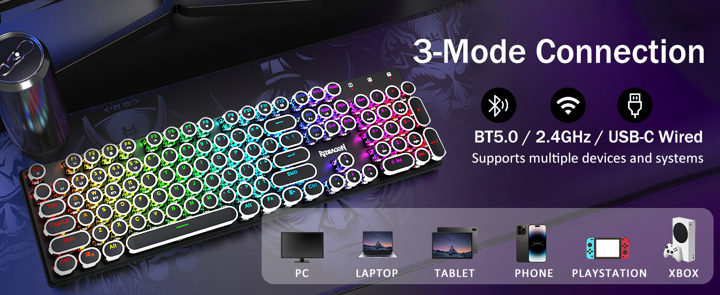 𝟯-𝗠𝗼𝗱𝗲 𝗖𝗼𝗻𝗻𝗲𝗰𝘁𝗶𝗼𝗻 -Оснащений інноваційною технологією трирежимного з’єднання Redragon, провідним USB-C, бездротовим режимом Bluetooth 5.0/3.0 і 2,4 ГГц, які підвищують користувацький досвід у всіх сферах. Натисніть FN+Q/W/E для переходу в режим Bluetooth, натисніть FN+R для переходу в режим 2,4G.