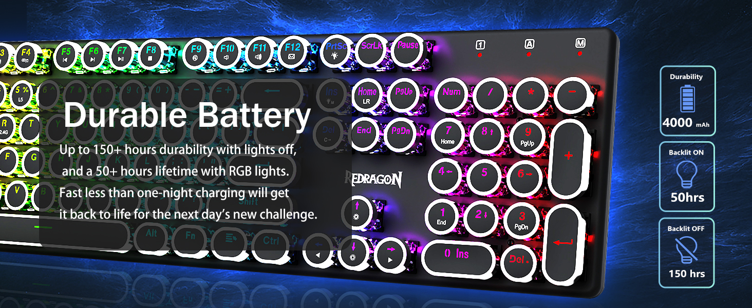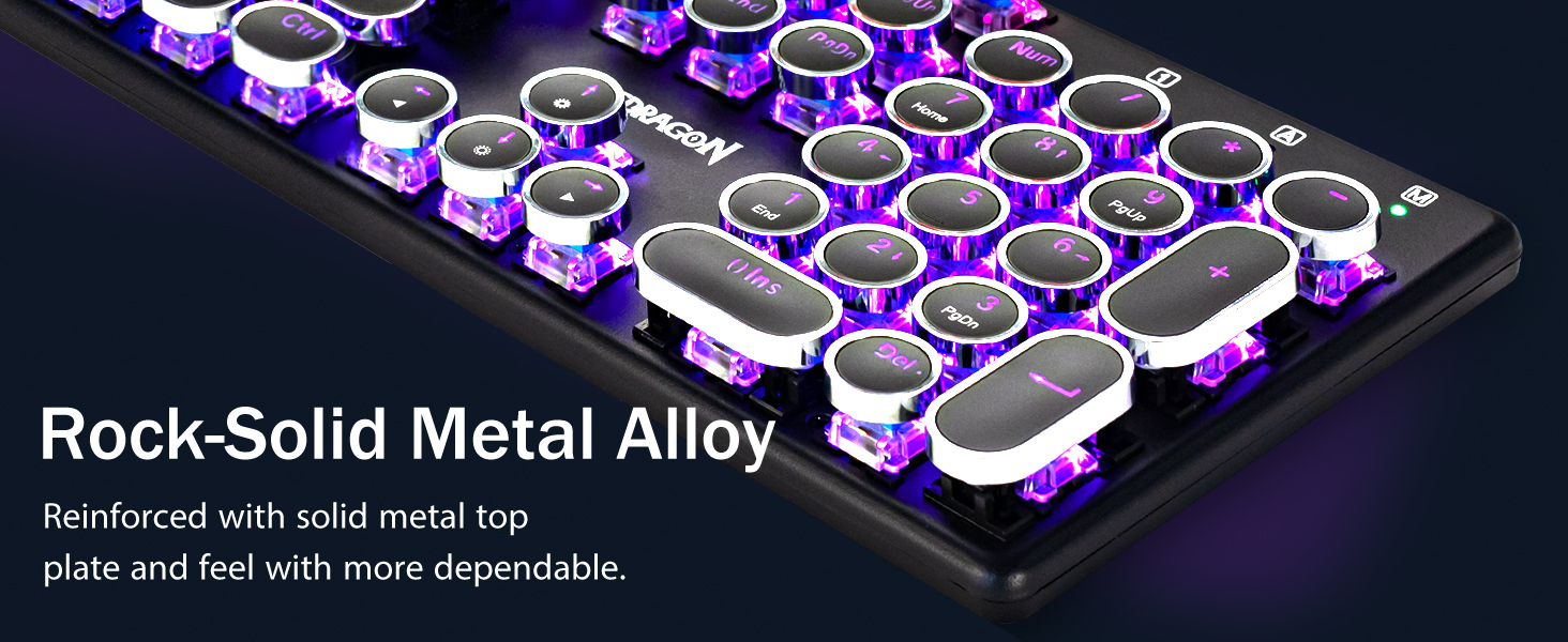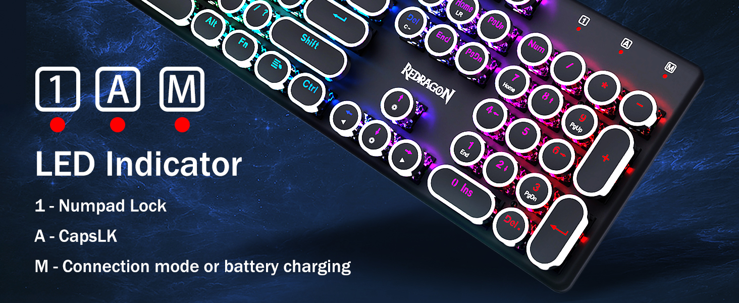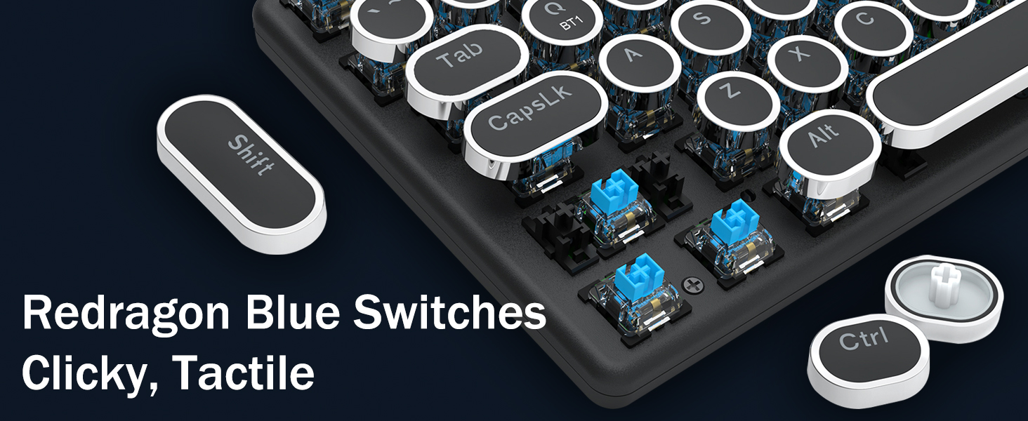 𝗥𝗲𝘁𝗿𝗼 𝗧𝘆𝗽𝗲𝘄𝗿𝗶𝘁𝗲𝗿 𝗦𝘁𝘆𝗹𝗲 𝘄𝗶𝘁𝗵 𝗠𝗲𝗰𝗵𝗮𝗻𝗶𝗰𝗮𝗹 𝗞𝗲𝘆𝘀 -Механічні сині перемикачі Redragon забезпечують середній опір, чутний клацаючий звук і тактильний зворотний зв'язок, забезпечують чутливе та точне ігрове середовище та продуктивність. Вінтажна клавіатура у стилі стімпанк із круглими ковпачками виглядає як класична друкарська машинка, забезпечує комфортне відчуття набору тексту та стабільне клацання.