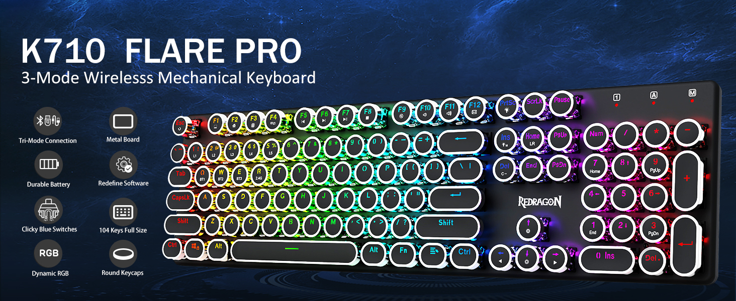 Chuangquan, провідний китайський виробник, представляє бездротову ігрову клавіатуру Redragon Black K710 у стилі бездротової друкарської машинки — поєднання вінтажного дизайну та передової продуктивності. Завдяки тактильним синім перемикачам, яскравому RGB-підсвічуванню та потрійному режиму підключення ця клавіатура забезпечує безперебійну гру та введення тексту. Ідеально підходить для масових закупівель, Chuangquan пропонує конкурентоспроможні заводські ціни та надійну підтримку OEM/ODM для глобальних постачальників, яким потрібна якісна ігрова периферія.