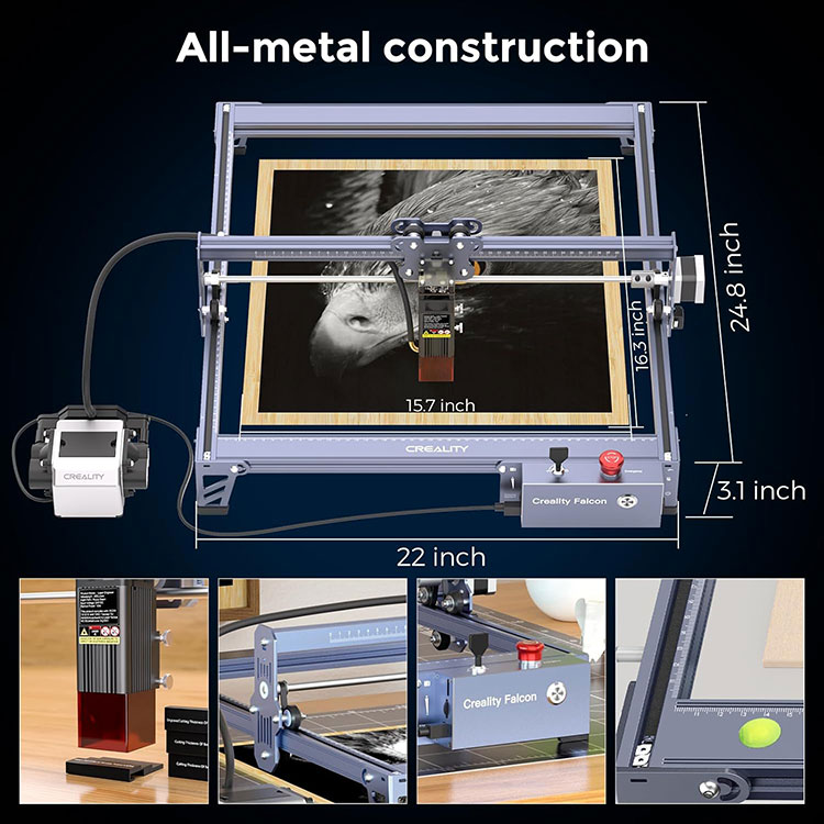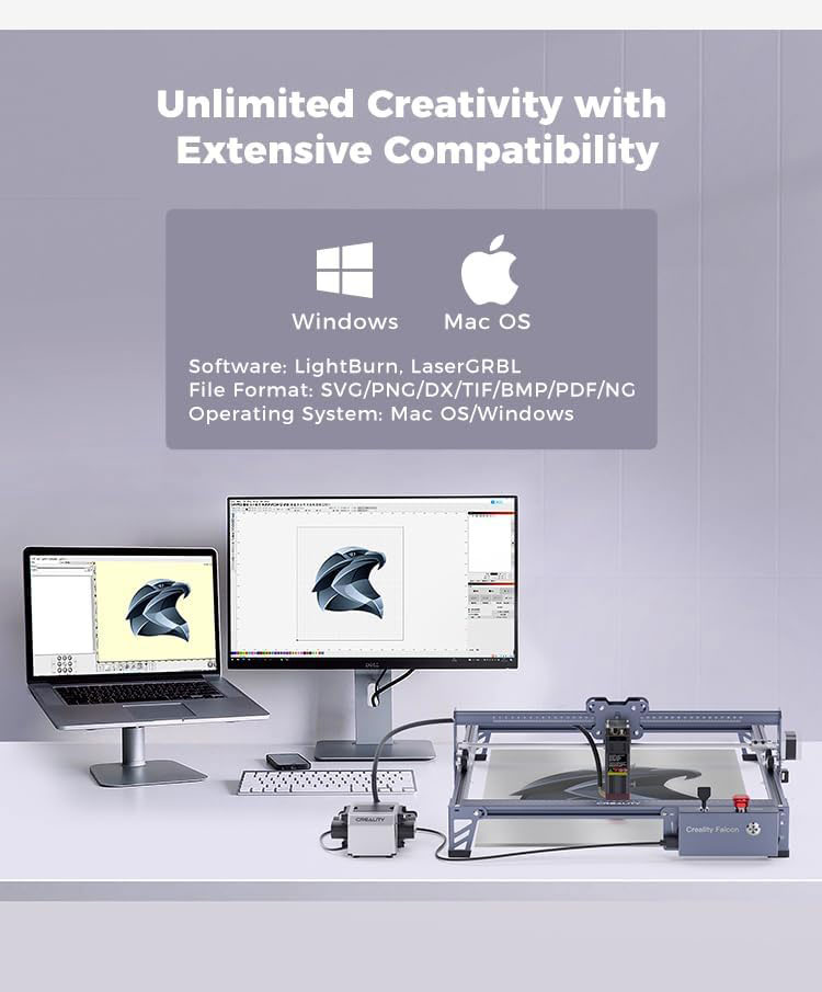 · 【Міцний і довговічний з деталями сумісності】Точність і плавність руху забезпечують анодовані алюмінієві сплави, L-подібні силіконові накладки та 8-міліметрова сталева рейка. Вбудований нівелір запобігає ковзанню та відкалібрований, щоб визначити, чи правильно розташоване обладнання для лазерного гравірування. Після отримання пакета ви повинні встановити його самостійно; це займає близько 10 хвилин. Лазерний гравер Creality falcon сумісний із різноманітними програмами для гравірування, включаючи LightBurn для досвідченого користувача лазера та LaserGRBL для новачка.