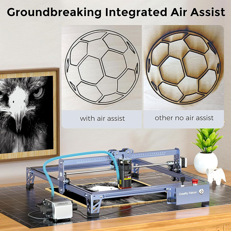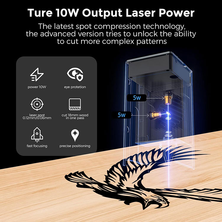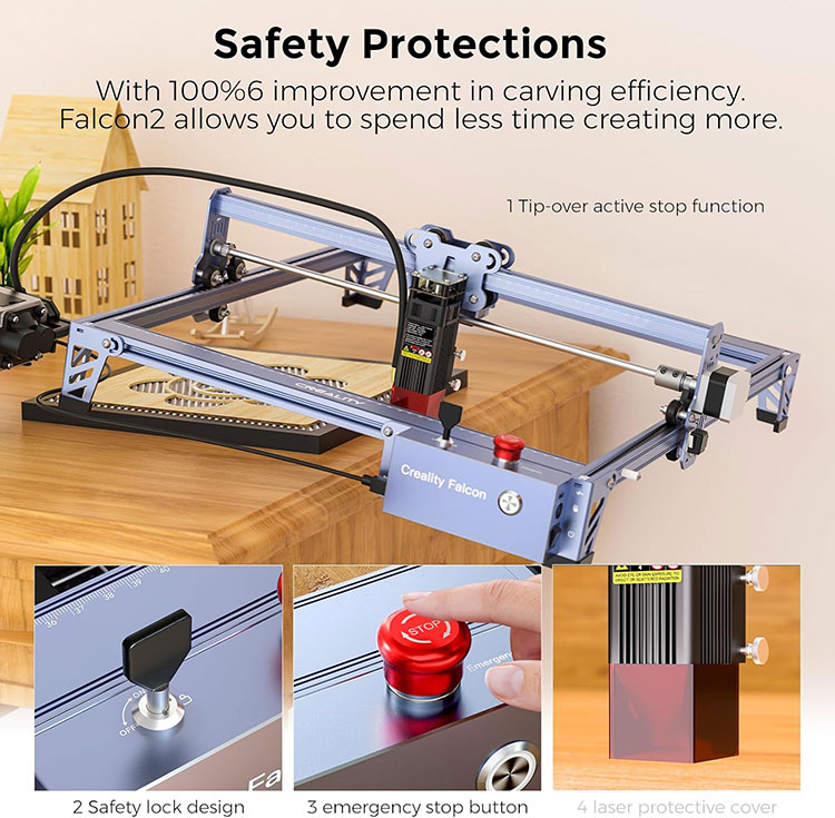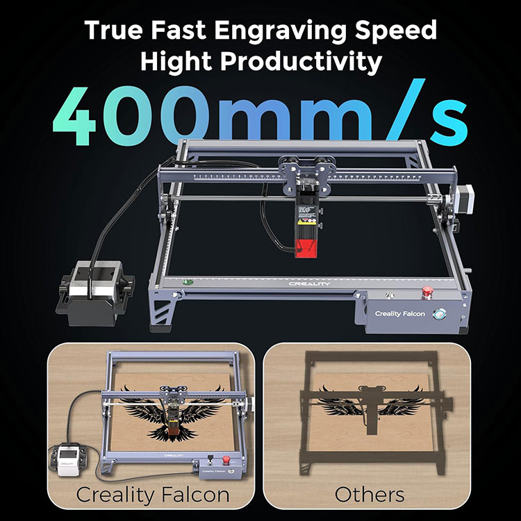 · 【Нове оновлення та потужна машина】Лазерний гравер Creality Falcon Pro 10 Вт має потужність машини 72 Вт і вихідну потужність 10 Вт. Зі швидкістю до 10000 мм/м він може розрізати 5-мм липу, 12-мм дерев’яну дошку або 3-мм чорний акриловий лист за один прохід. Він також оснащений пневматичним допоміжним механізмом, який допоможе вам з легкістю виконувати завдання з різьблення. Клас лазера: клас 4