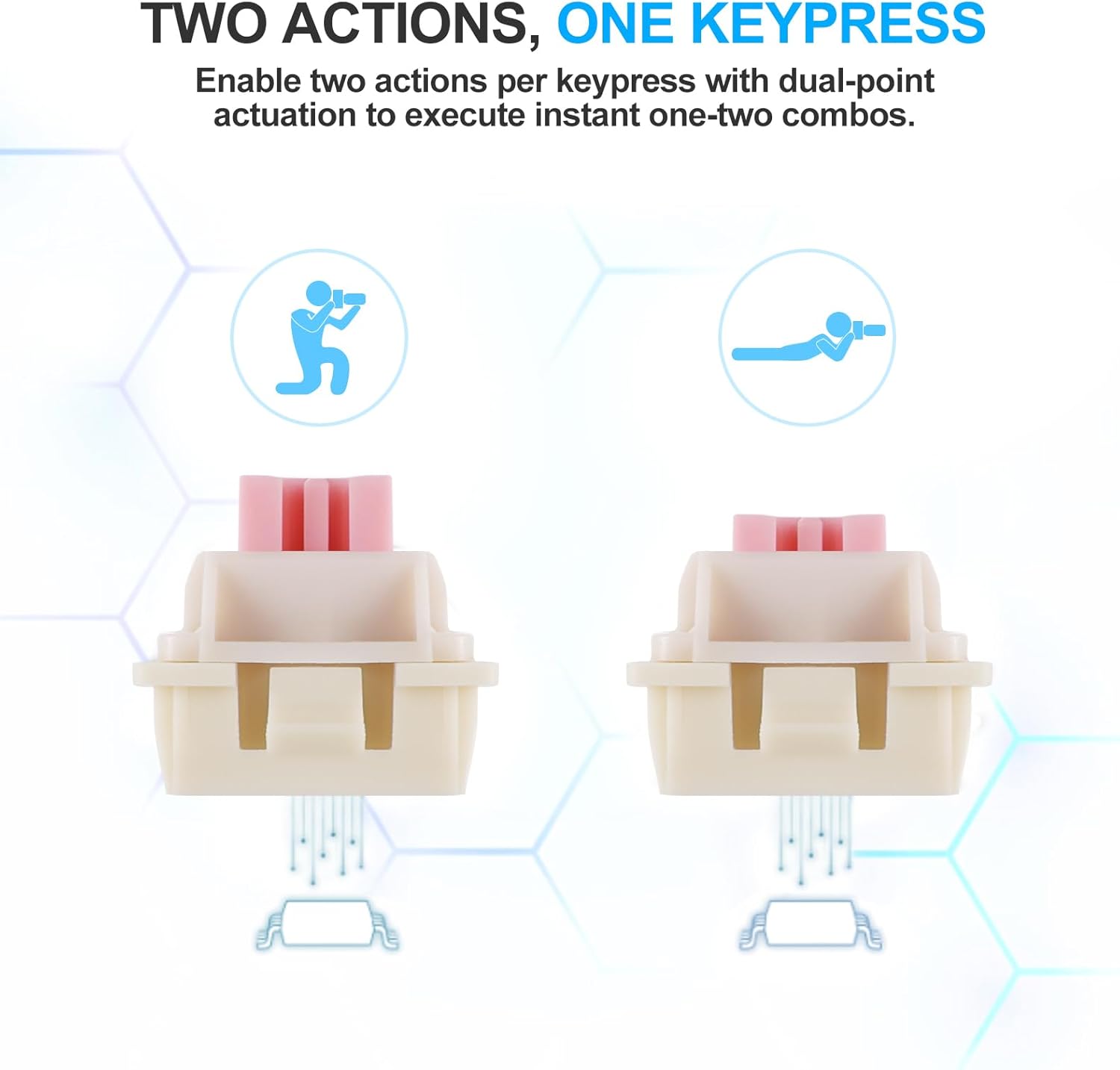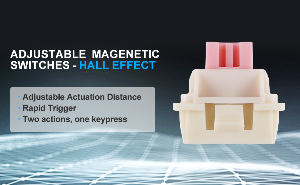 Магнітні перемикачі використовують датчики Холла для виявлення руху клавіш, забезпечуючи регульовані точки спрацьовування та послідовне розпізнавання введення. На відміну від традиційних механічних перемикачів, ця технологія зменшує фізичний знос і забезпечує тривалу стабільність.