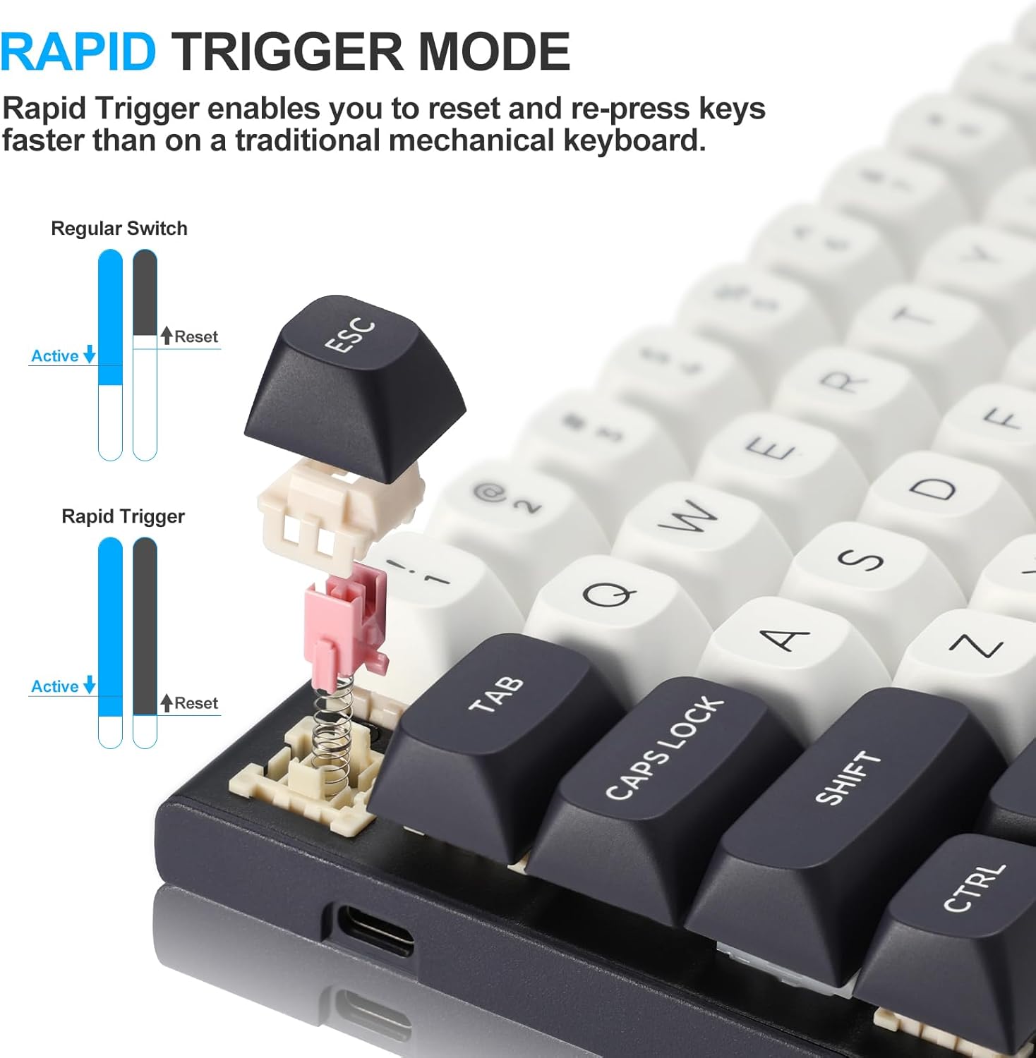 Біло-синьо-чорна механічна ігрова клавіатура K701 Rapid Trigger 60% Wired Magnetic Switch створена для користувачів, які надають перевагу точності, швидкості та компактному форм-фактору. Його поєднання технології магнітного перемикача, функції швидкого запуску та міцної конструкції робить його надійним вибором як для ігор, так і для продуктивності.