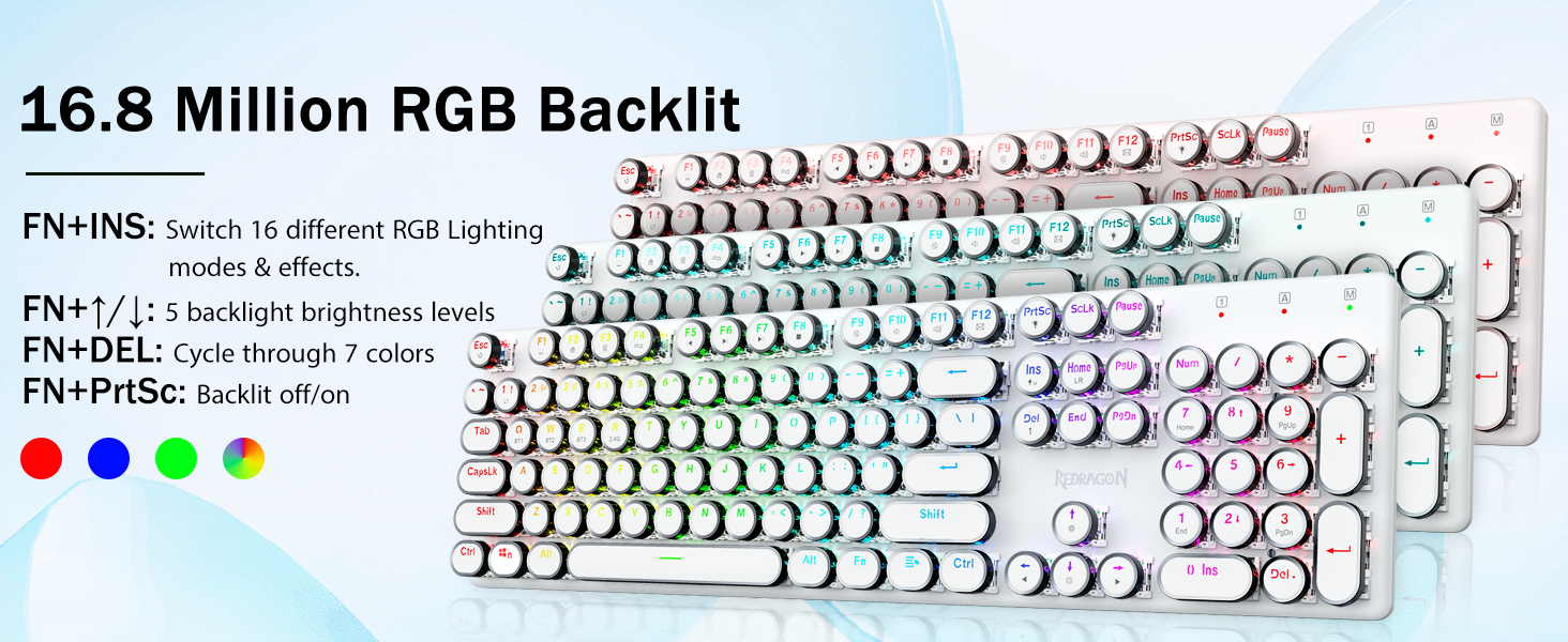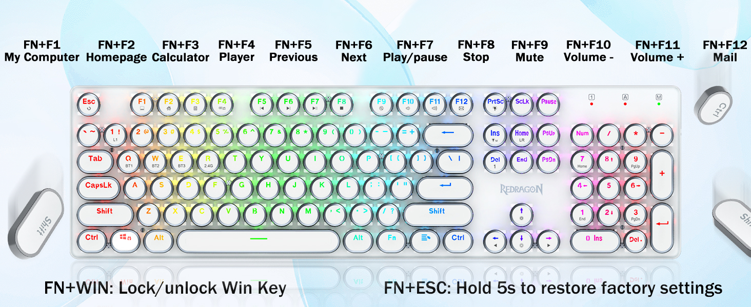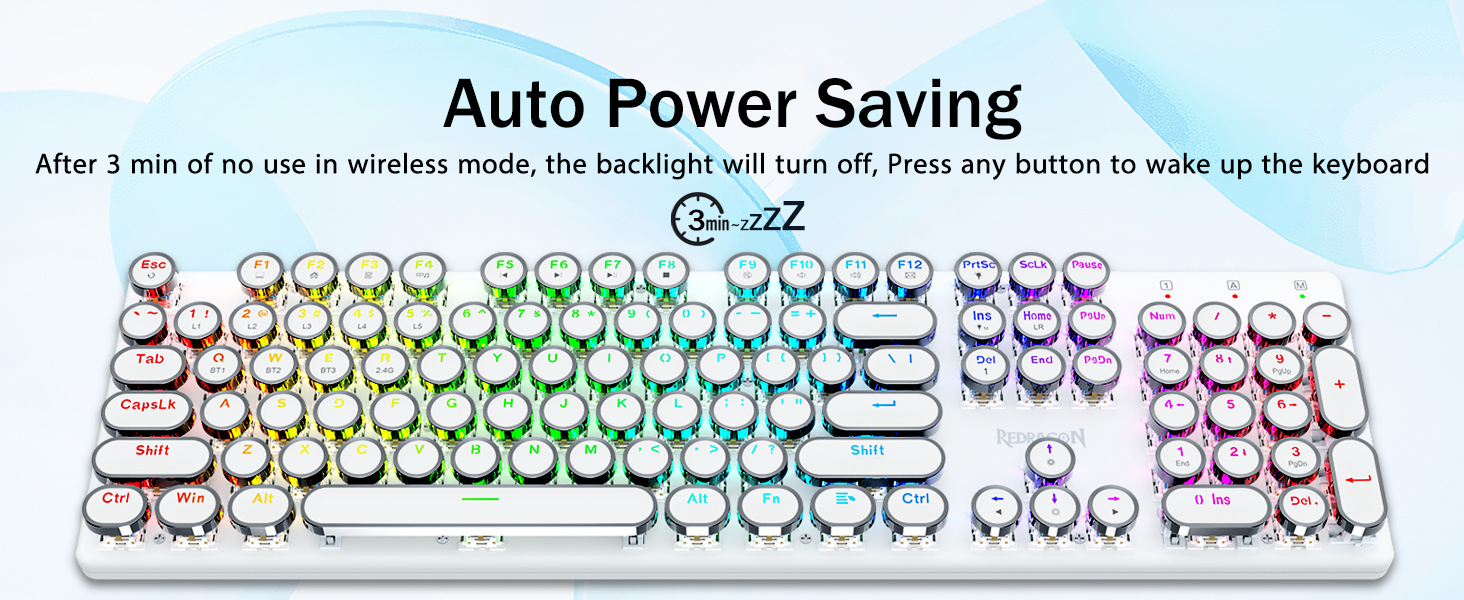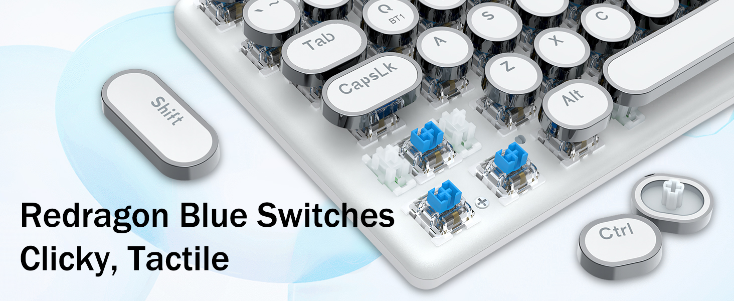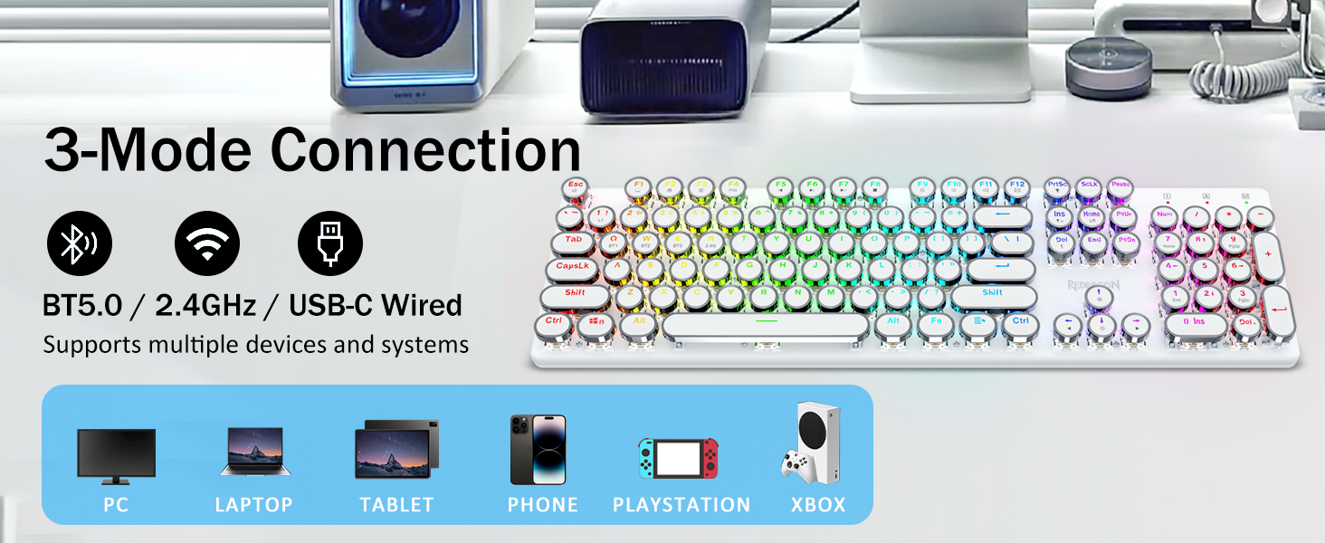 𝗥𝗲𝘁𝗿𝗼 𝗧𝘆𝗽𝗲𝘄𝗿𝗶𝘁𝗲𝗿 𝗦𝘁𝘆𝗹𝗲 𝘄𝗶𝘁𝗵 𝗠𝗲𝗰𝗵𝗮𝗻𝗶𝗰𝗮𝗹 𝗞𝗲𝘆𝘀- Оснащено інноваційною технологією трирежимного з’єднання Redragon, дротовим USB-C, бездротовим режимом Bluetooth 3.0/5.0 і 2.4 ГГц, які підвищують користувацький досвід у всіх сферах. Натисніть FN+Q/W/E для переходу в режим Bluetooth, натисніть FN+R для переходу в режим 2,4G.