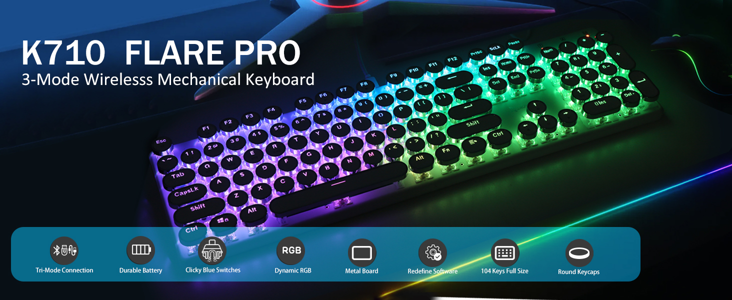 𝗗𝗲𝗽𝗲𝗻𝗱𝗮𝗯𝗹𝗲 𝗠𝗲𝘁𝗮𝗹 𝗣𝗮𝗻𝗲𝗹 & 𝟭𝟬𝟰 𝗞𝗲𝘆𝘀 𝗔𝗻𝘁𝗶 𝗚𝗵𝗼𝘀𝘁𝗶𝗻𝗴- Оновлена версія FLARE PRO продовжує використовувати той самий твердий металевий матеріал. Тримайте клавіатуру стійкою та елегантною на столі, щоб набирати текст преміум-класу. Клавіатура K710 підтримує 104-клавішну технологію anti-ghosting, що дозволяє натискати декілька клавіш одночасно без конфлікту.